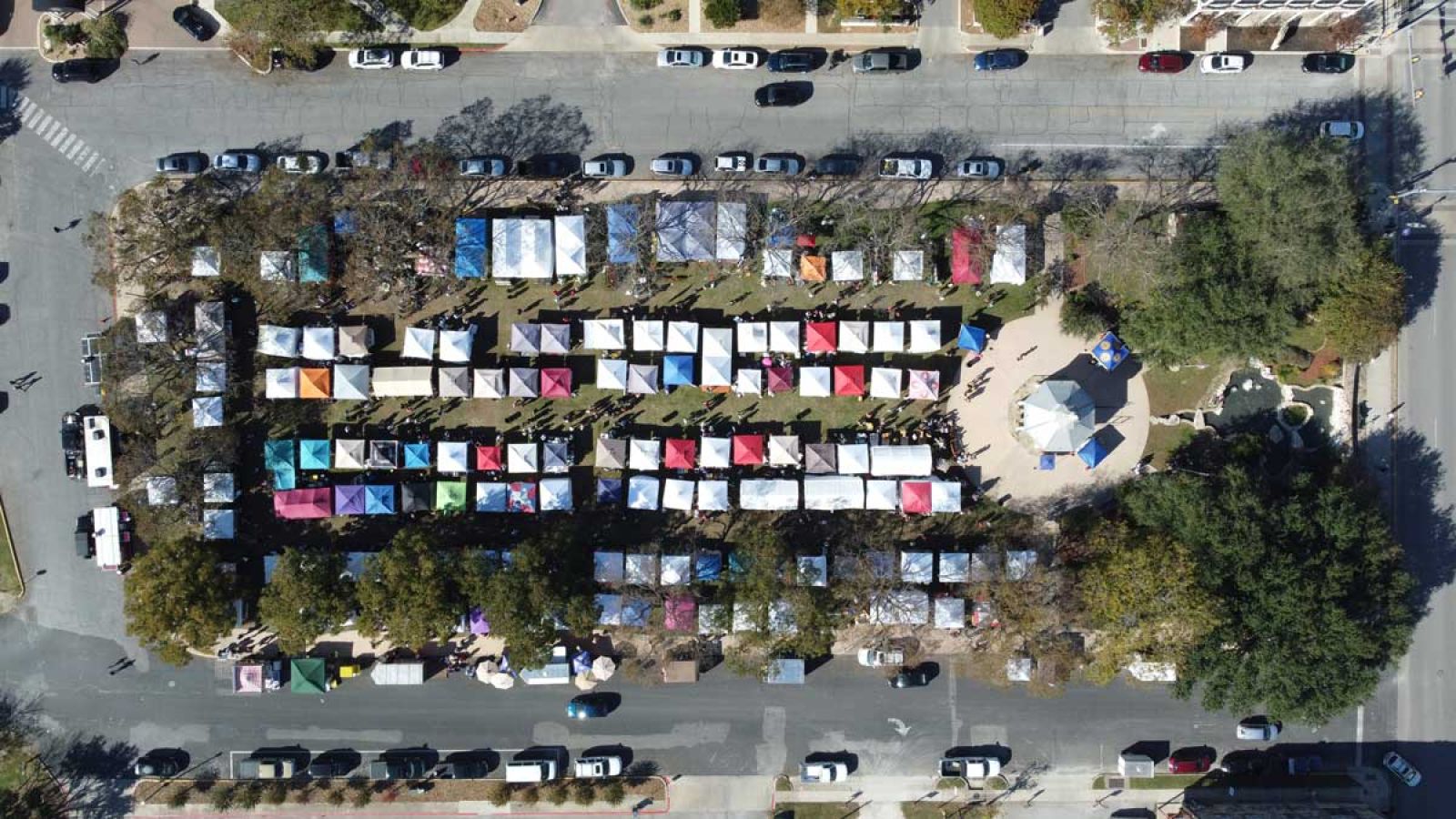 Booth locations are marked by numbered flags. Vendors are required to use a canopy and bring their own tables, chairs and extension cords of up to 100′ if electric is needed. Electricity is available at a limited number of locations, so please indicate in advance if it is required. Each canopy must be weighted (suggested min. 20lbs per leg) or secured with screw in type pet stakes. NO HAMMERED OR STRAIGHT STAKES ALLOWED IN MAIN PLAZA due to sprinkler lines. Tables are to be draped or covered. Public restroom facilities are available for vendor and customer use.